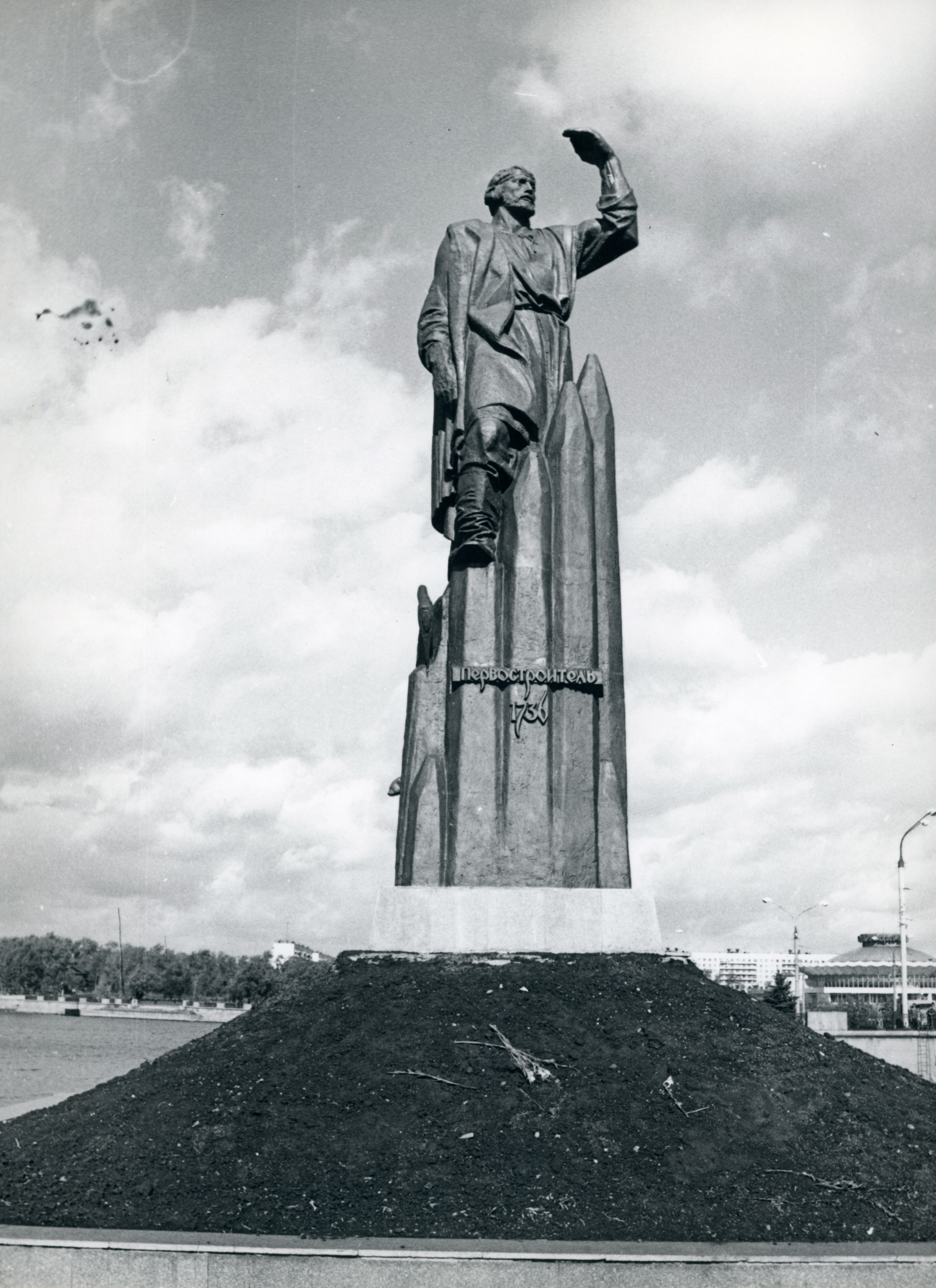С сожалением приходится констатировать, что такое сооружение создано не было. Вместо него, памятника на конкретную личность, в сентябре 1986 года в городе, на набережной Миасса, было установлено скульптурное сооружение[,] представляющее собой художественное произведение на вымышленный сюжет[vi]. Сооружение изображает человека (русского мужика), стоящего с топором у начатой им стены примитивного тынового острожка и пристально всматривающегося вдаль. На скульптуре надпись: «Первостроитель»[vii]. По наличию этой надписи сооружение именуется — «Памятник первостроителям города»[viii].