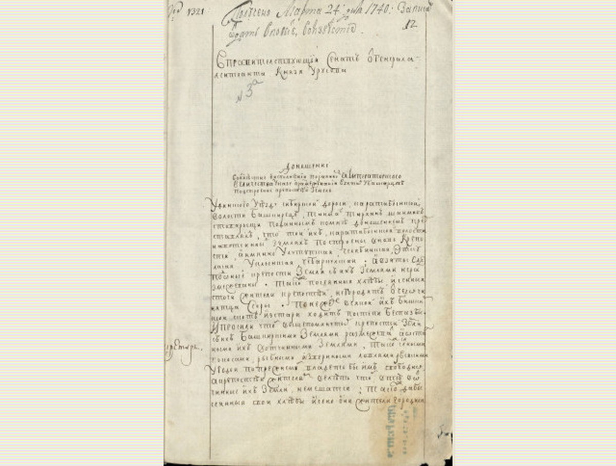 Доношение князя Василия Урусова в Сенат о предложении тархана Таймаса Шаимова провести межевание земель для построенных крепостей. 13 марта 1740 года